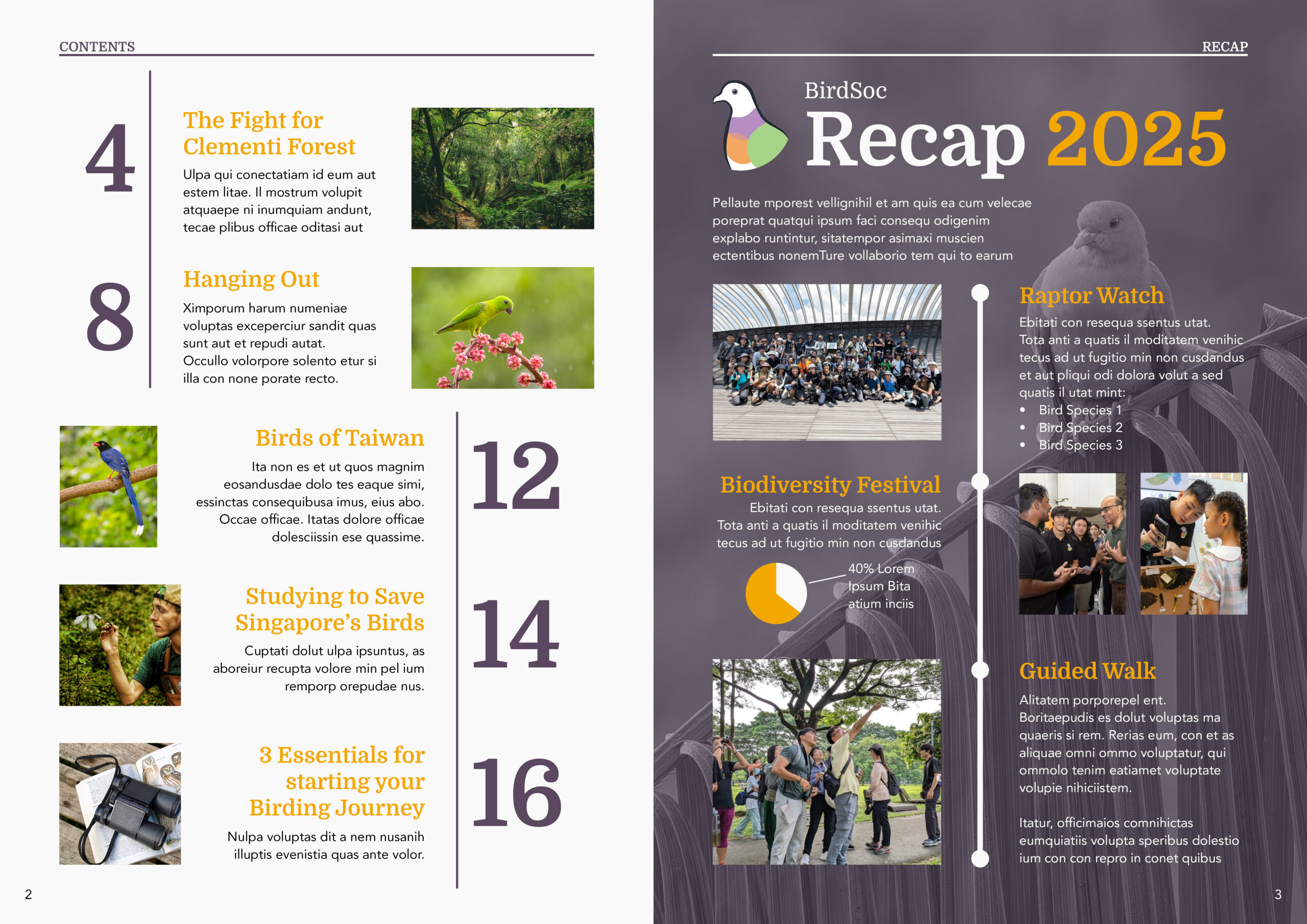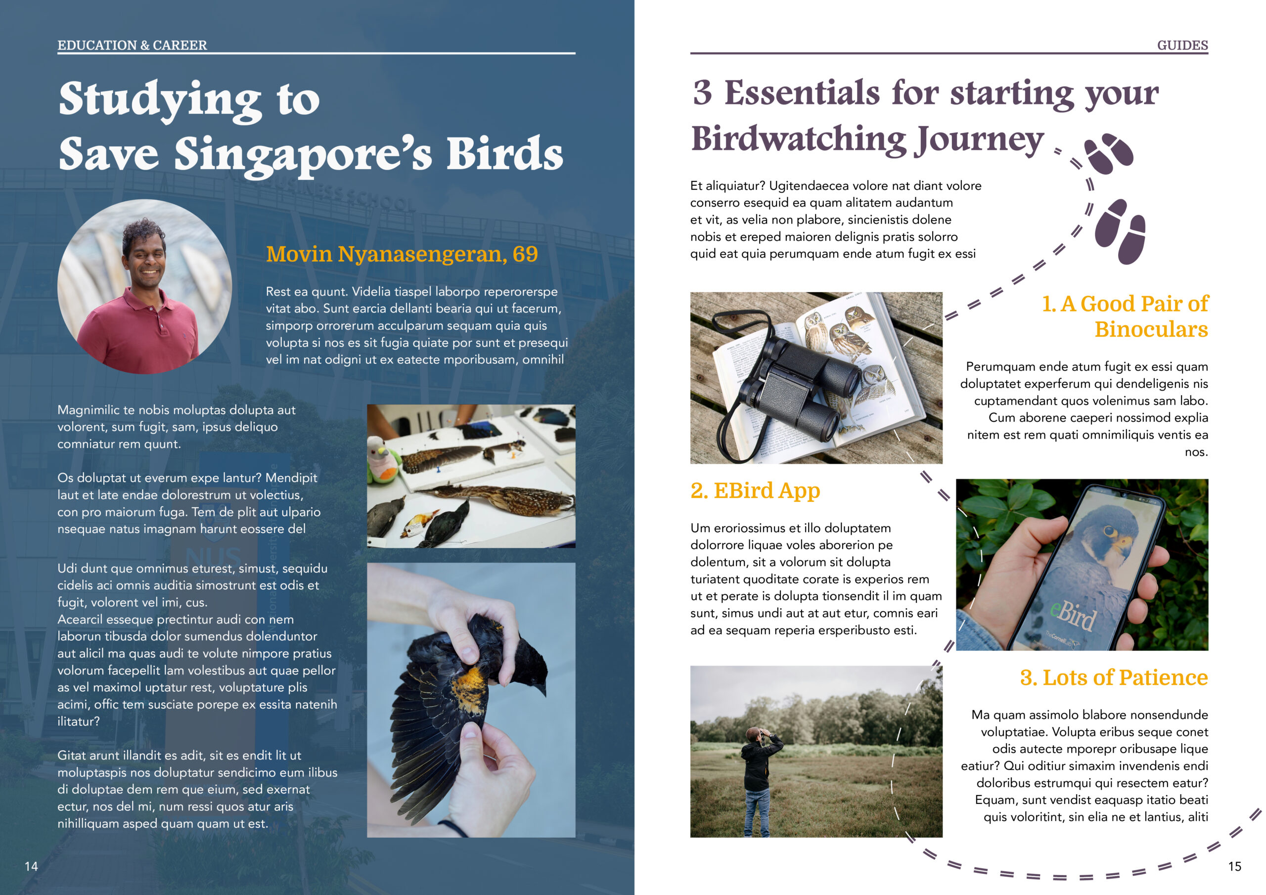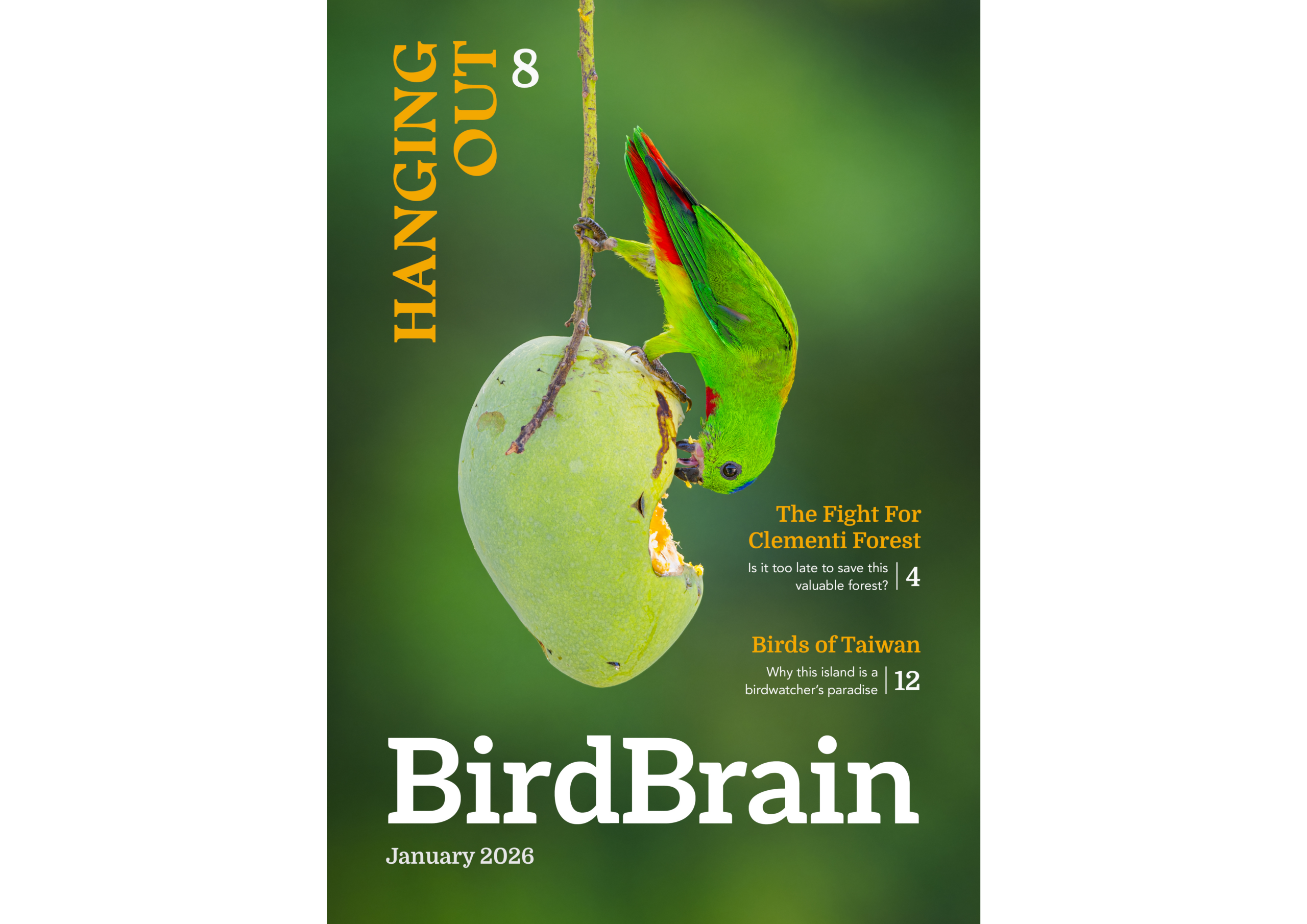 This magazine design was created for the course NM4208 Strategic Communication Design (AY25/26 S1), as part of a communications package for a chosen non-profit or advocacy organisation in Singapore. This unofficial mockup is my vision of what a magazine for the Bird Society of Singapore could look like.